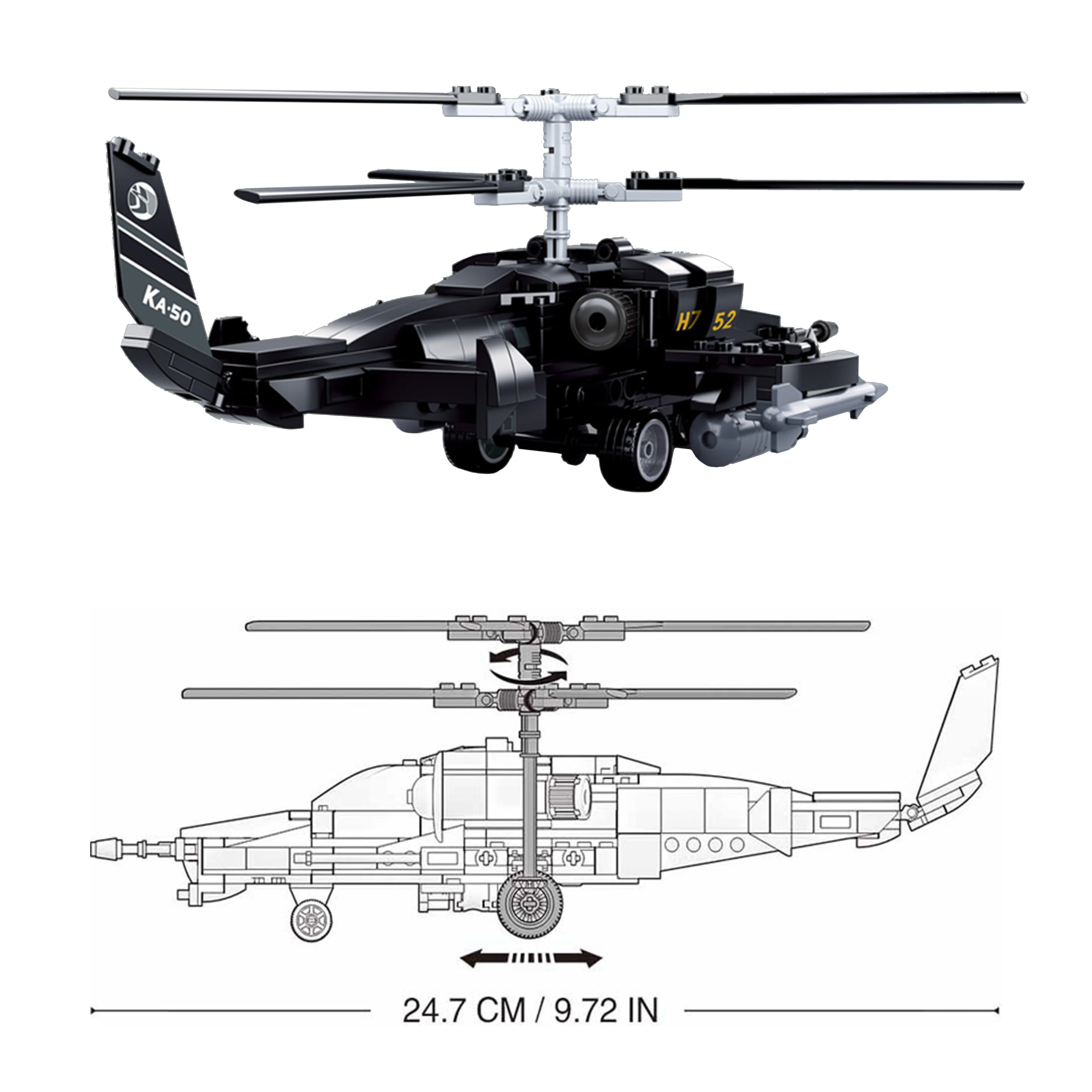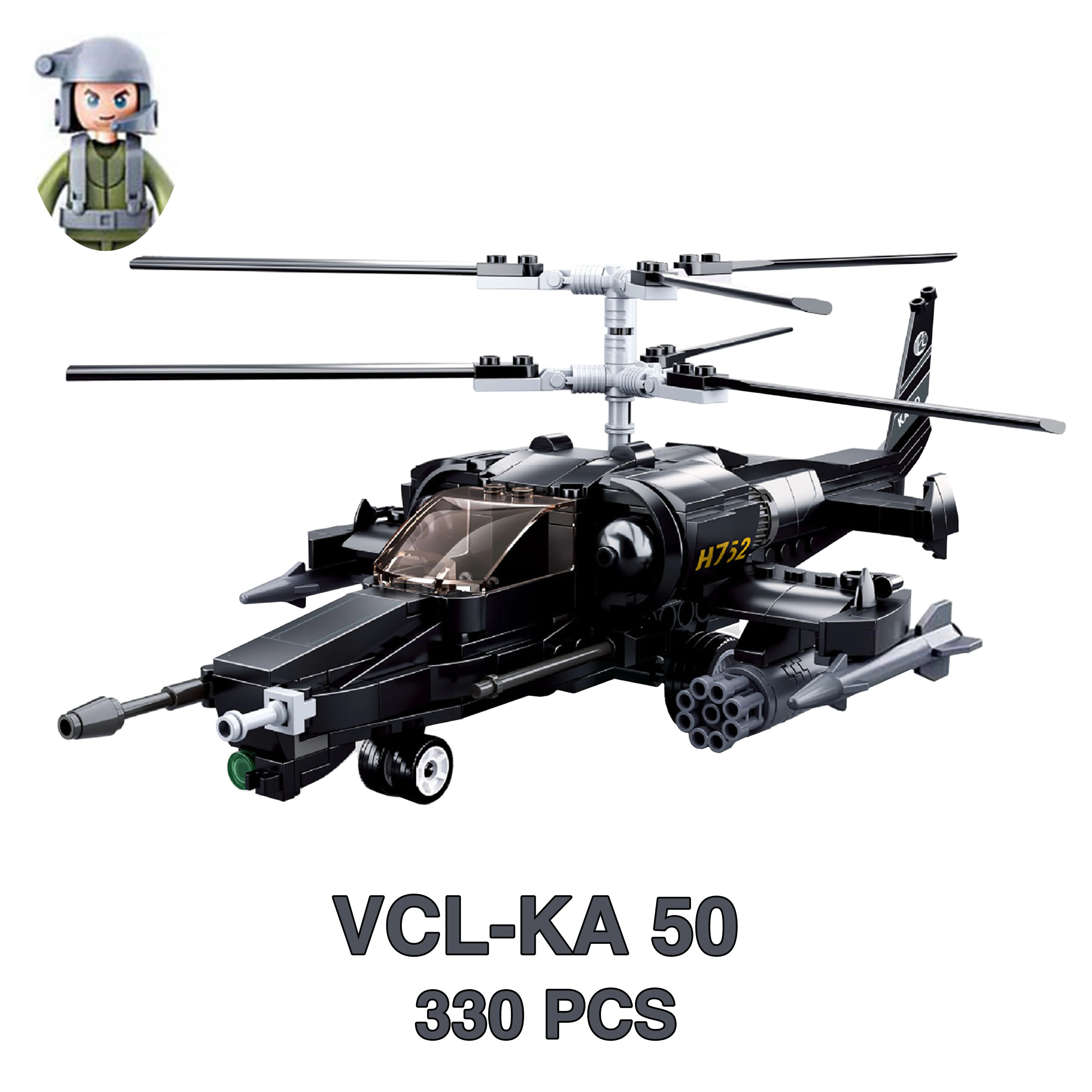 KA-50 Black Shark helicopter gunships, 1 pilot, total 330 PCS blocks, 1 color detailed assembly manual.