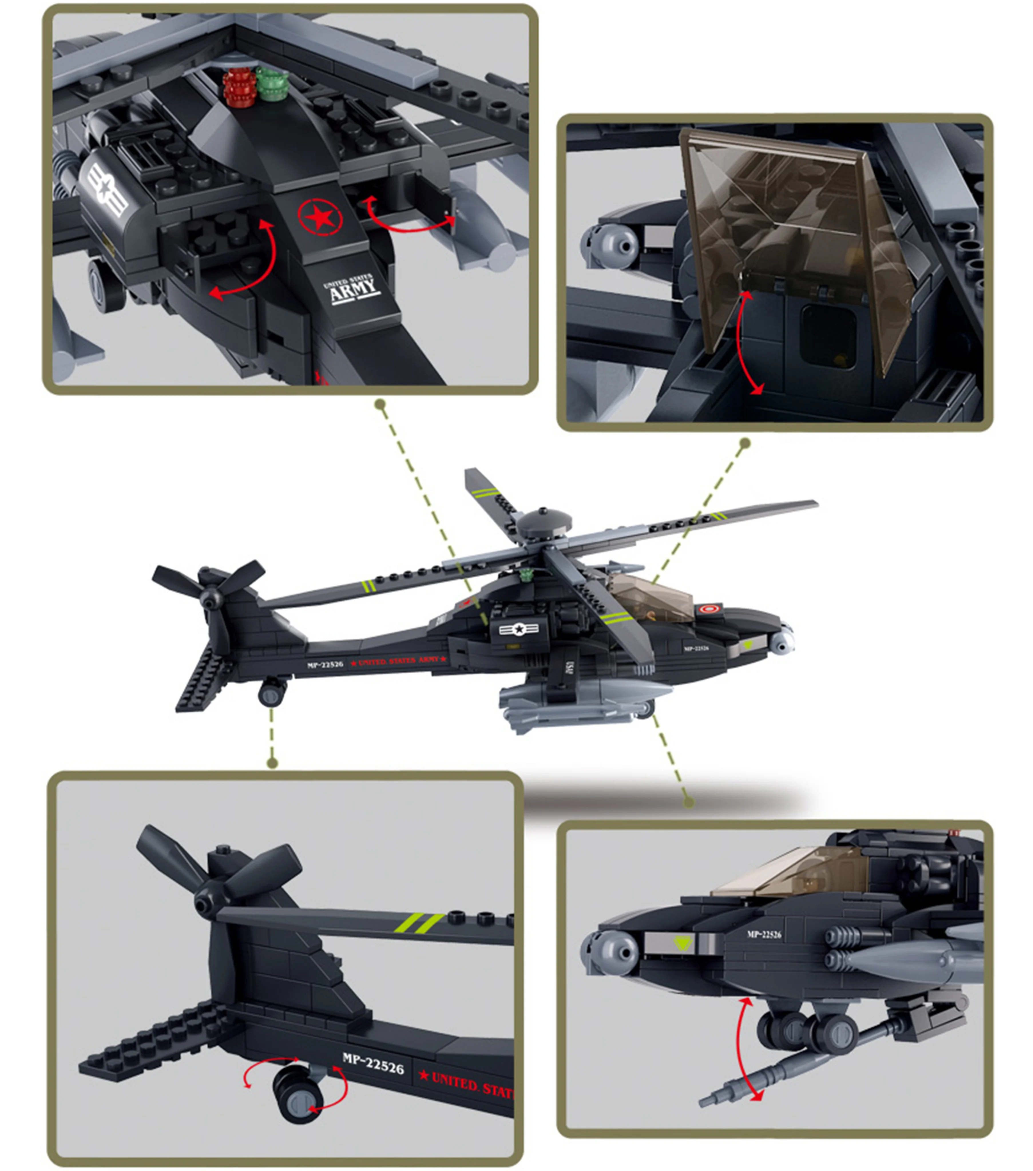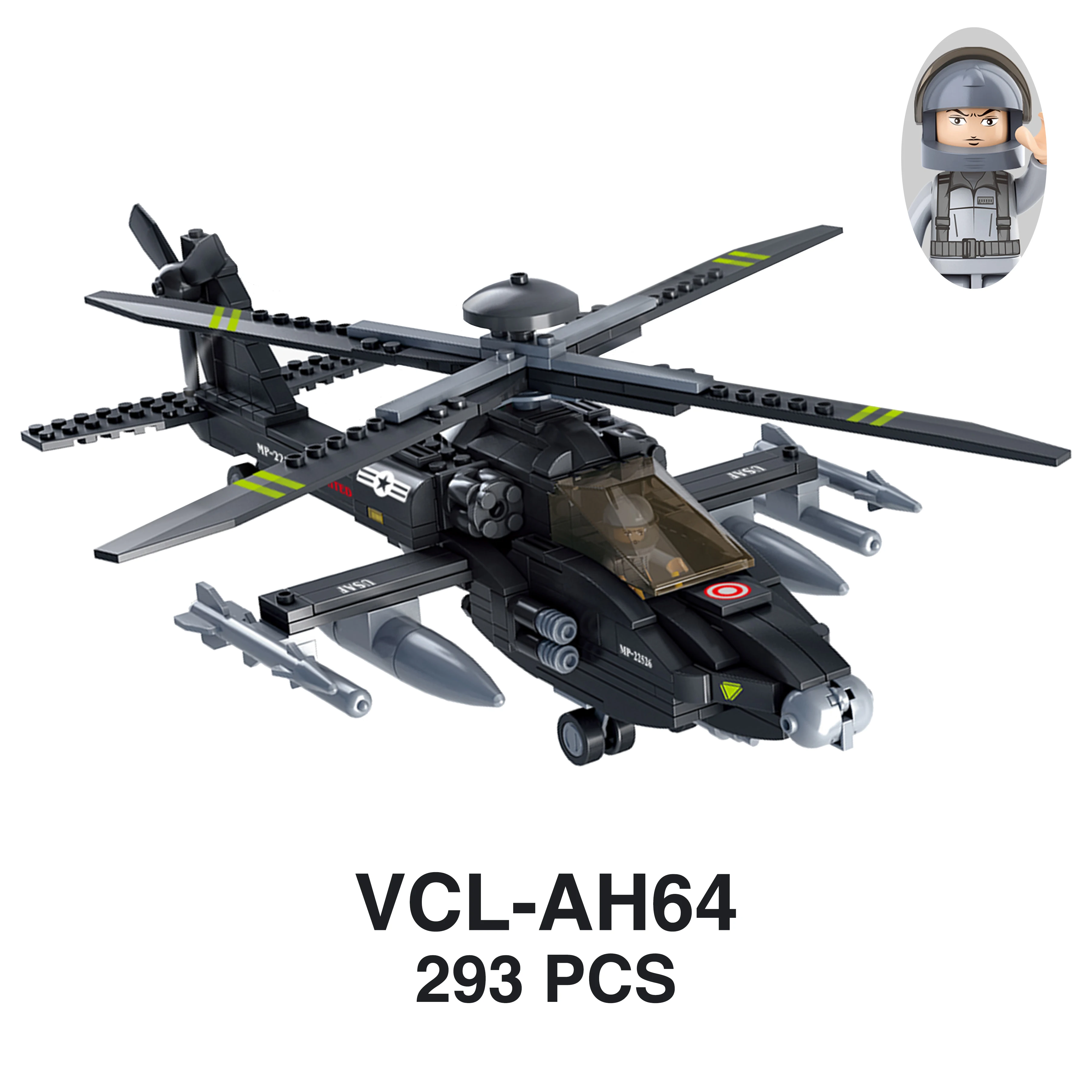 AH-64 helicopter gunships, 1 pilot, total 293 PCS blocks, 1 color detailed assembly manual.