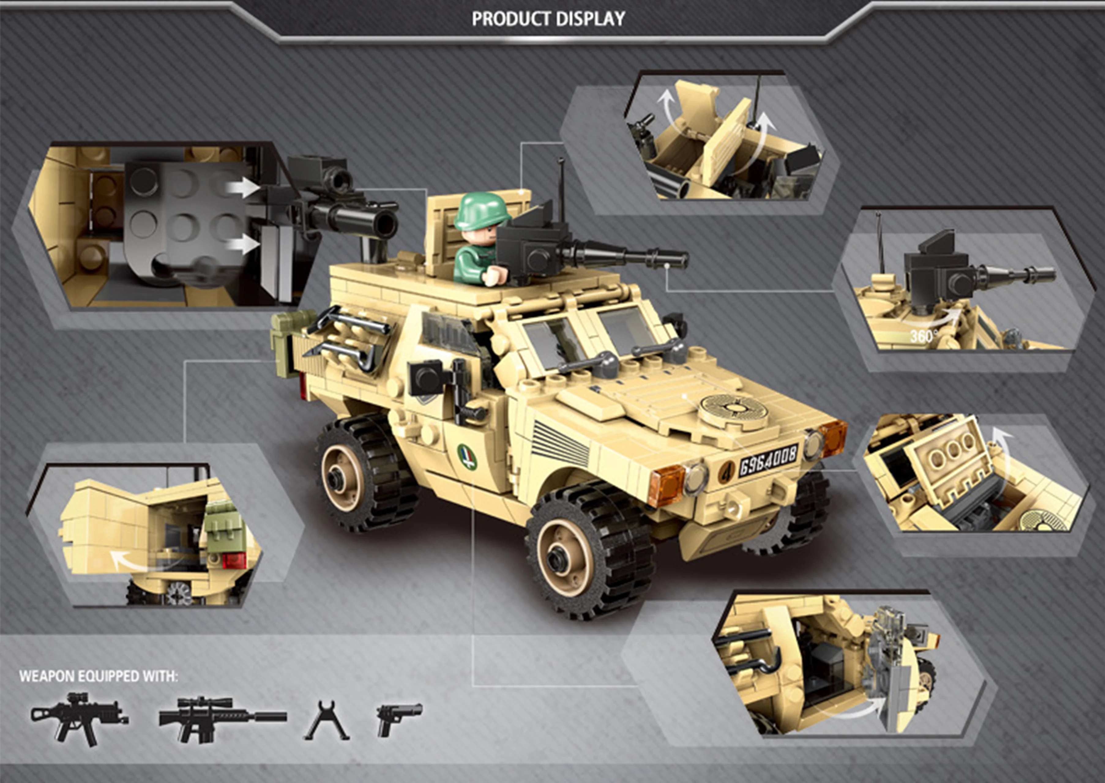 HMMWV, 2 soldiers, total 265 PCS blocks, 1 color detailed assembly manual.